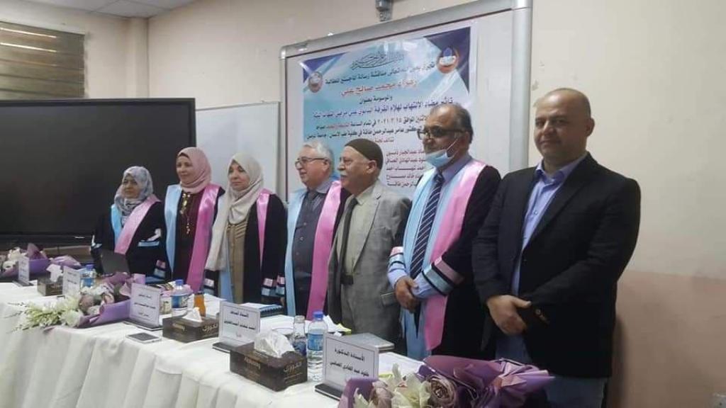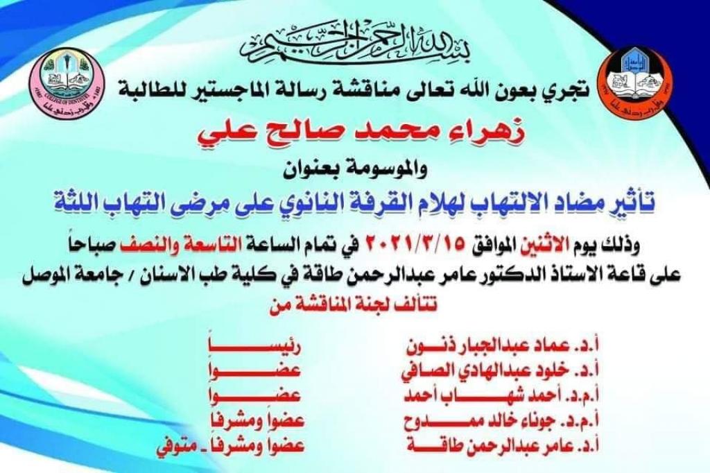 ناقش فرع علوم طب الأسنان الأساسية رسالة ماجستير بعنوان (تأثير مضاد الالتهاب لهلام القرفة النانوي على مرضى التهاب اللثة ) في موضوع أدوية الفم و ذلك يوم الأثنين الموافق ل ١٥/آذار /٢٠٢١ و في قاعة الأستاذ الدكتور عامر عبدالرحمن طاقة في كلية طب الأسنان.