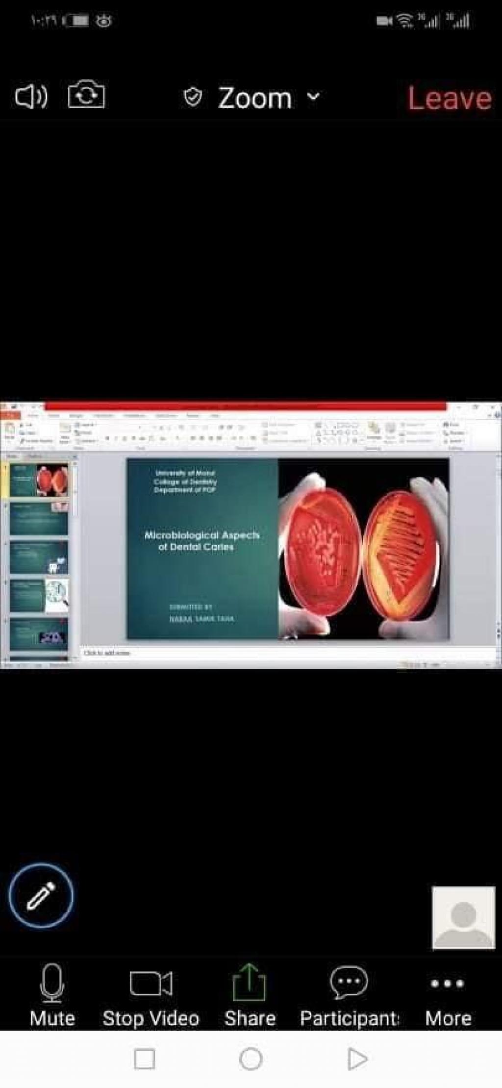 كما بينت الطالبة ان من اهداف هذا السمنار الوصول لطريقة مثلى لتجنب حدوث التسوس نتيجة عمل هذه البكتريا ومن ثم الوصول لصحة فم واسنان مثالية. قدمت السمنار من خلال برنامج zoom الالكتروني.