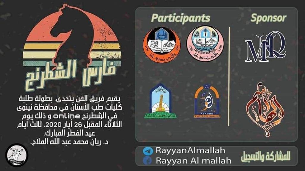 ضمن بطولة فرسان الشطرنج الطلابية التي يقيمها فريق الفن_يتحدى، استكمل يوم ٢٦/ ايار/ ٢٠٢٠ ، الدورين الأول و الثاني من البطولة لفئة الطلاب، و تأهل : فاروق جمعة و حسن أحمد من كلية طب الأسنان/ جامعة الموصل، و عبدالوهاب وليد و عبيدة احمد و عبدالرحمن طارق و عبدالله احمد من قسم طب الأسنان /كلية النور الجامعة.