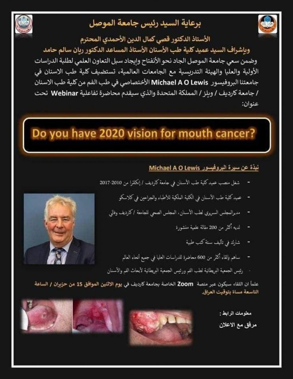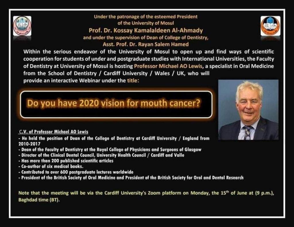 برعاية السيد رئيس جامعة الموصل المحترم أ. د. قصي كمال الدين الأحمدي و بإشراف السيد عميد كلية طب الأسنان أ. م. د. ريان سالم حامد ، و استمرارا لسلسلة الوبينارات التي تقيمها الكلية ضمن الجهود المبذولة للتواصل و الانفتاح و التعاون مع الجامعات العالمية، تستضيف كلية طب الأسنان مساء يوم الإثنين ١٥ / حزيران ٢٠٢٠ البروفيسور مايكل لويس اختصاص طب الفم في جامعة كارديف/ ويلز/المملكة المتحدة في محاضرة تحت عنوان:
