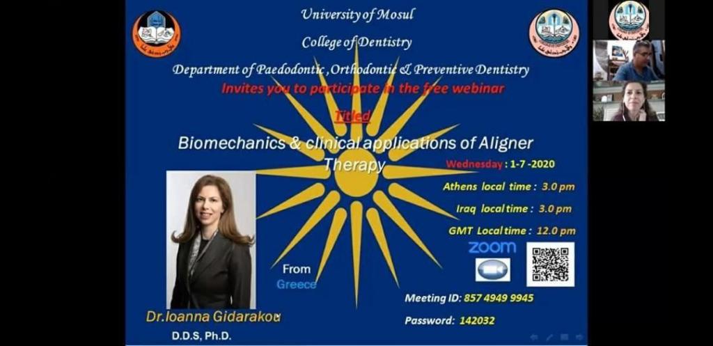 استضافت كلية طب الاسنان جامعة الموصل يوم الاربعاء المصادف للاول من تموز للعام 2020 وفي تمام الساعة الثالثة عصرا بتوقيت بغداد محاضرة علمية من خلال منصة برنامج الزوم. قدمتها الدكتورة Ioanna Gidarakou—(يوانا كيداراكو) الاختصاصية في تقويم الاسنان الشفاف من جامعة أرسطو في سالونيك Aristotle University of Thessalonik من اليونان بمحاضرة ويبنر بعنوان :(Biomechanics & clinical applications of Aligner therapy)