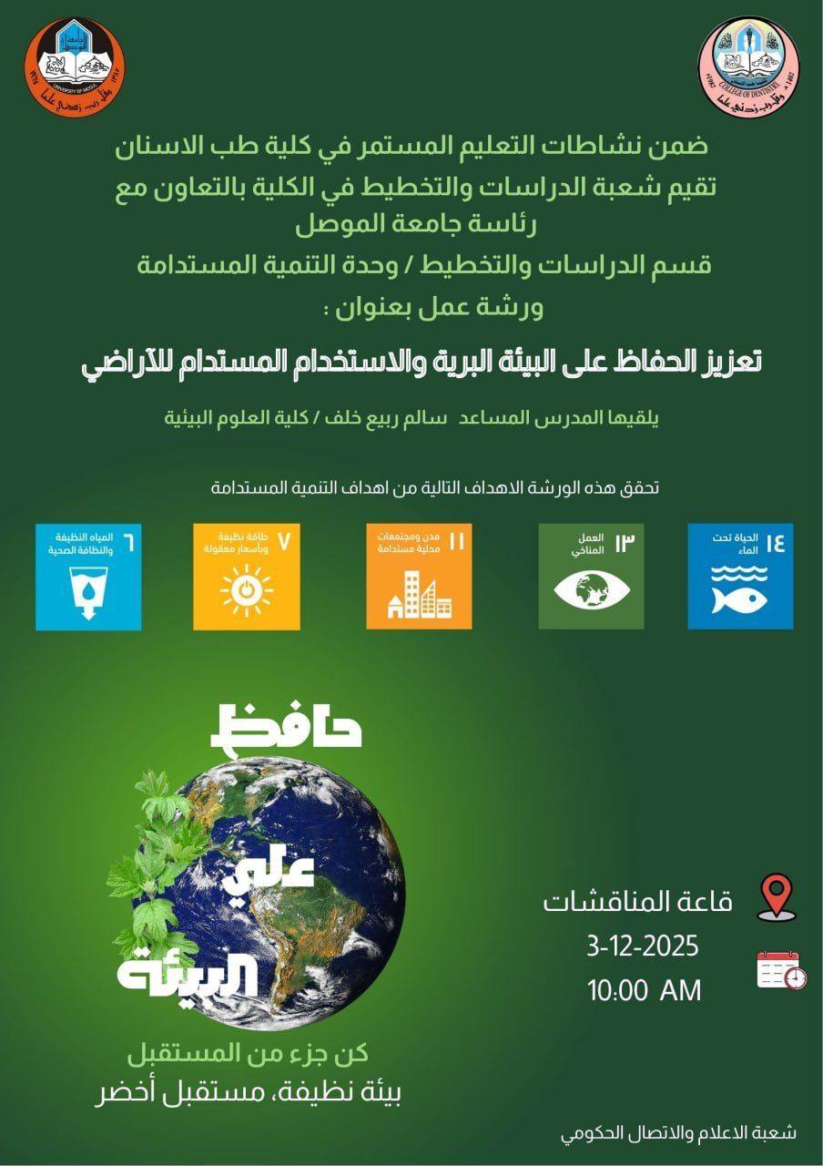 نظّمت شعبة الدراسات والتخطيط ولجنة التنمية المستدامة في كلية طب الأسنان، اليوم الأربعاء الموافق الثالث من كانون الأول، وبالتعاون مع قسم الدراسات والتخطيط / وحدة التنمية المستدامة في رئاسة جامعة الموصل، ورشة عمل بعنوان: “تعزيز الحفاظ على البيئة البرية والاستخدام المستدام للأراضي”.