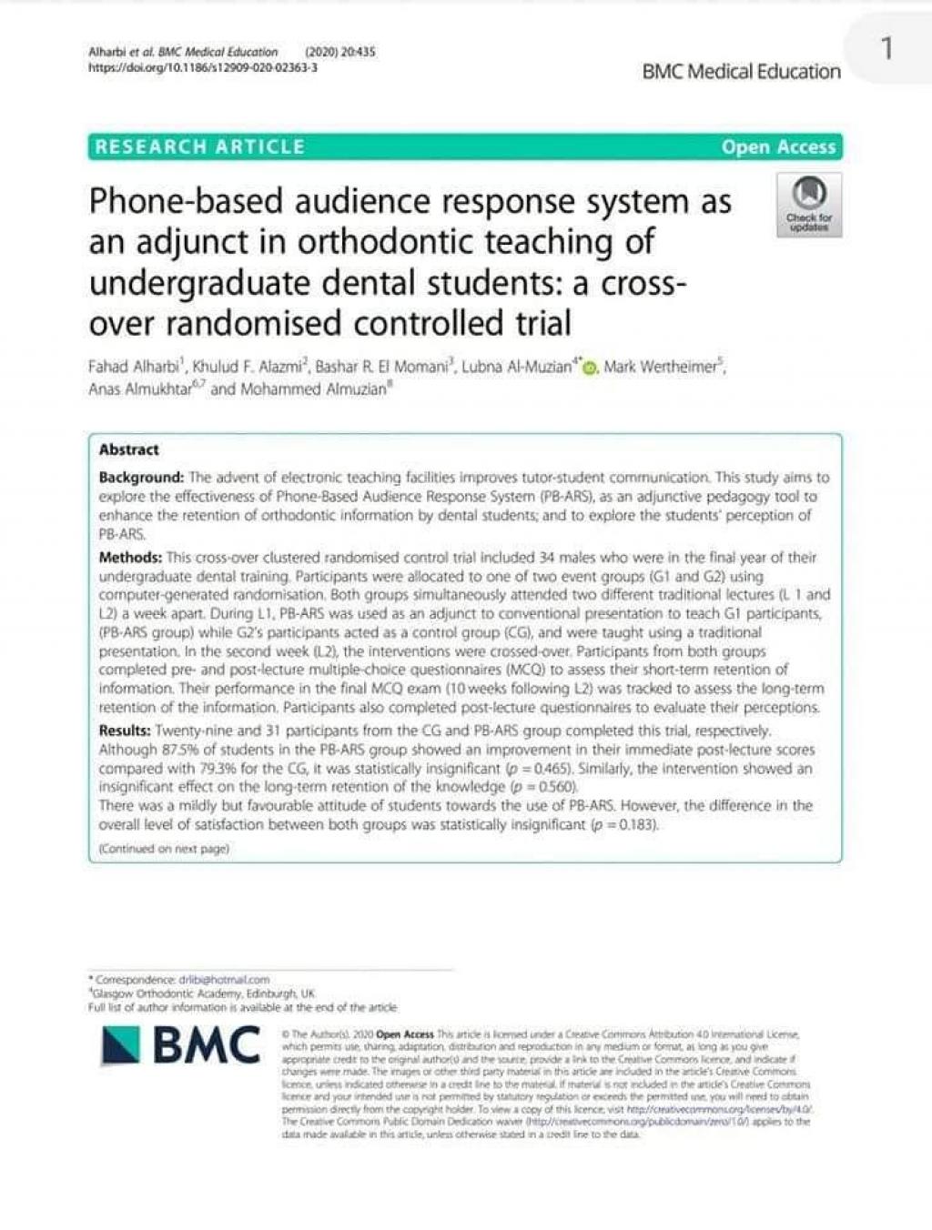 (phone-based audience response system (PBS-ARS) ، كأداة تربوية مساعدة لتعزيز الاحتفاظ بمعلومات تقويم الأسنان من قبل طلاب طب الأسنان..