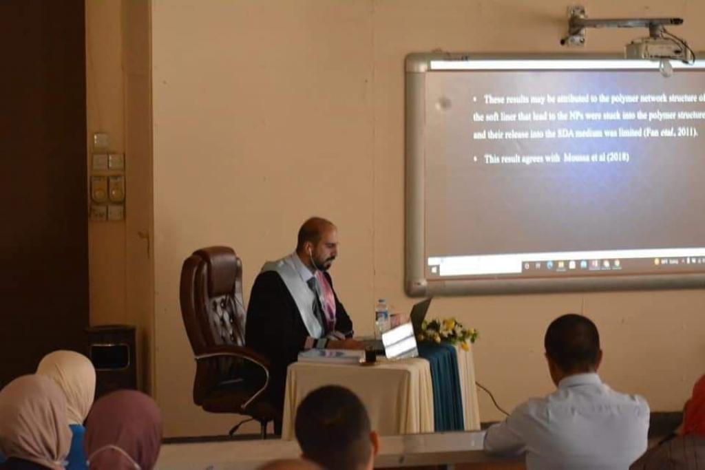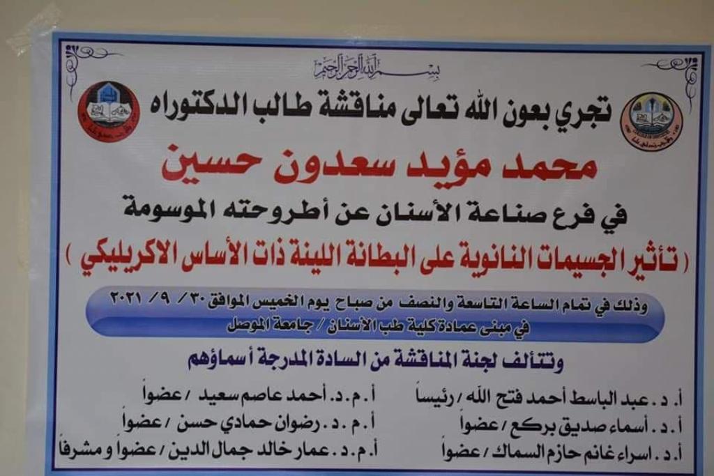 تم في فرع صناعة الاسنان بكلية طب الاسنان جامعة الموصل يوم الخميس الموافق ٣٠ / أيلول/ ٢٠٢١ وعلى قاعة أ.د. تهاني عبد العزيز الصندوق إجراء مناقشة أطروحة الدكتوراة الموسومة:( تأثير الجسيمات النانوية على البطانة اللينة ذات الأساس الاكرليكي )..