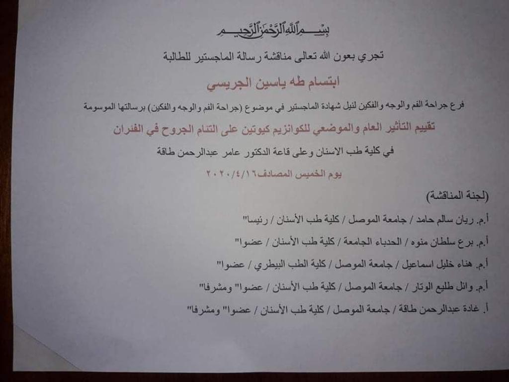 بحضور السيد مساعد رئيس جامعة الموصل للشؤون العلمية الاستاذ الدكتور منير طه، و على قاعة أ. د. عامر طاقة رحمه الله ، تمت على بركة الله اليوم ١٦/ نيسان مناقشة رسالة الماجستير للطالبة ابتسام طه الجريسي في فرع جراحة الفم والوجه والفكين، والموسومة: تقييم التاثير العام و الموضعي لمساعد الانزيم كيوتين على التئام الجروح في الفئران.Evaluation of Systemic and Topical Effects of Coenzyme Q10 on Wound Healing in Miceتألفت لجنة المناقشة من السادة :