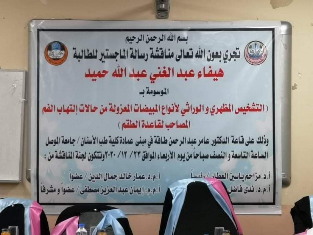 جرت بعون الله تعالى اليوم الأربعاء الموافق 23/12/2020 مناقشة رسالة مقدمة إلى جامعة الموصل/كلية طب الأسنان من قبل للطالبة المتوفاة (هيفاء عبدالغني عبدالله) كجزء من متطلبات نيل شهادة الماجستير في الاحياء المجهرية الفموية والموسومة :