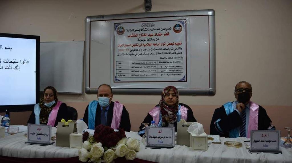 جرت بعون الله تعالى اليوم الأحد الموافق 6/12/2020 مناقشة رسالة الماجستير للطالبة (ظفر مقداد عبدالفتاح) عن رسالتها الموسومة ( تقييم لبعض أنواع الرغوة الهلامية في تقليل النسخ الجاف )