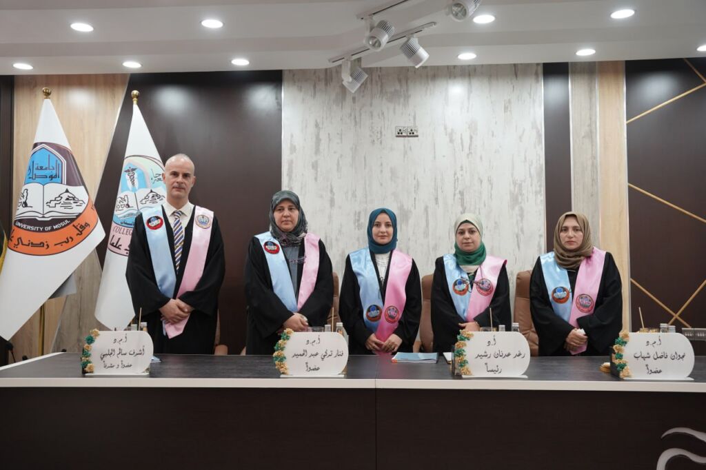 ترأس لجنة المناقشة الأستاذ الدكتور (رغد عدنان رشيد) وعضوية كل من الأستاذ (وئام محمد عمر) والأستاذ المساعد الدكتور (مها انور حسين) وبإشراف وعضوية الأستاذ المساعد الدكتور (سوسن حميد احمد).