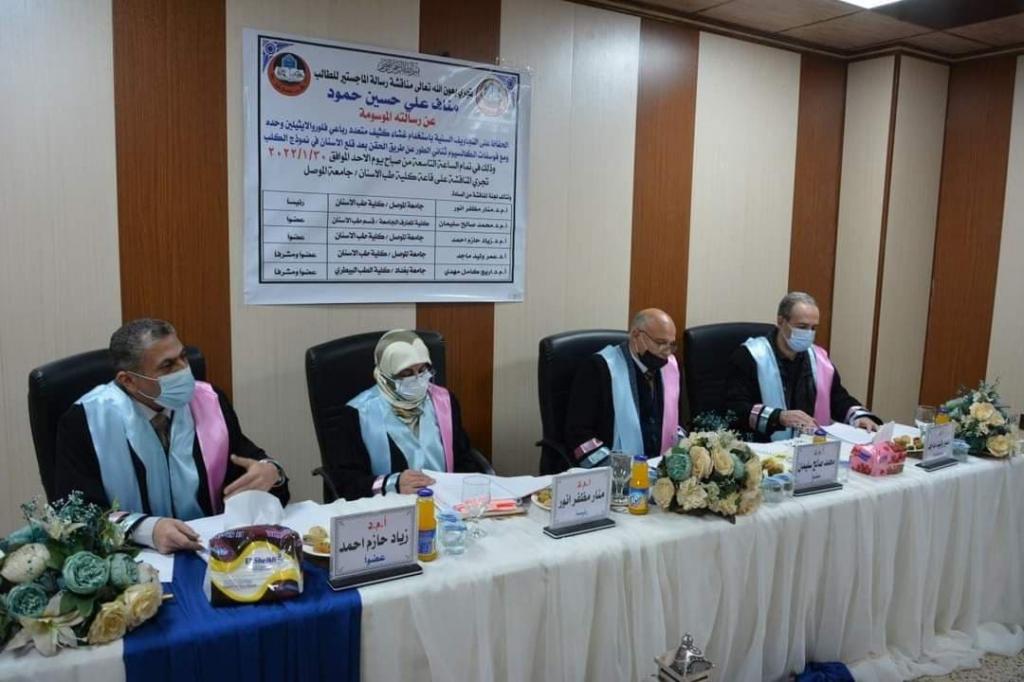 ناقشت كلية طب الأسنان بجامعة الموصل رسالة ماجستير حول الحفاظ على الحافة السنخية بأستخدام غلاف كثيف متعدد رباعي فلورو الأثيلين وحده و مع فوسفات الكالسيوم رباعية الطور بعد قلع الأسنان الجراحي في نموذج الكلب و ذلك يوم الأحد الموافق ٣٠/ كانون الثاني/ ٢٠٢٢، حضرها عدد من تدريسيي الكلية وأطباء الأسنان.تناولت الرسالة التي تقدم بها الطالب مناف علي حسين في فرع جراحة الفم والوجه والفكين تقييم تأثير غلاف كثيف متعدد رباعي فلورو الأثيلين وحده و مع فوسفات الكالسيوم رباعية الطور على عملية التئام العظام السنخية و المحافظة على الحافة السنخية من الذوبان الناتج عن قلع الأسنان. كما هدف البحث إلى المقارنة بين تقدم عملية الشفاء لمجموعة التحكم ومجموعة الغشاء و مجموعة الغشاء مع فوسفات الكالسيوم خلال فترات الدراسة.