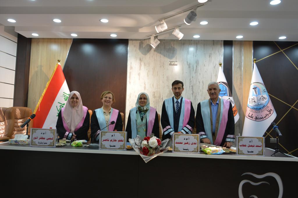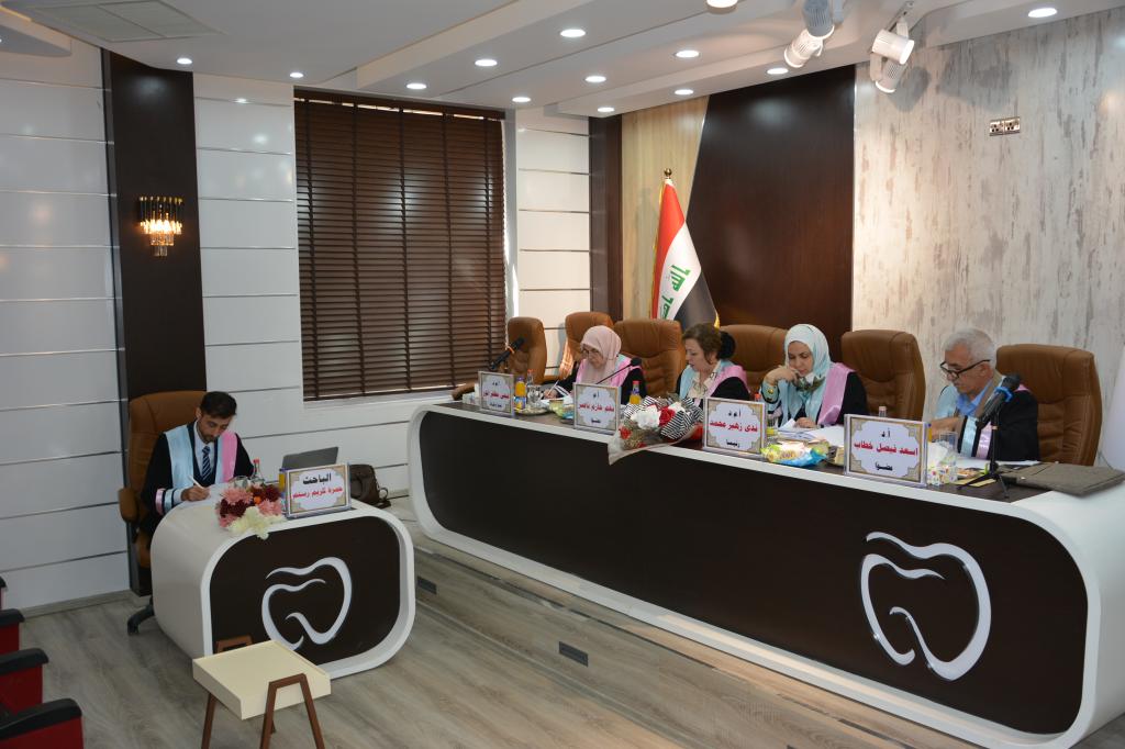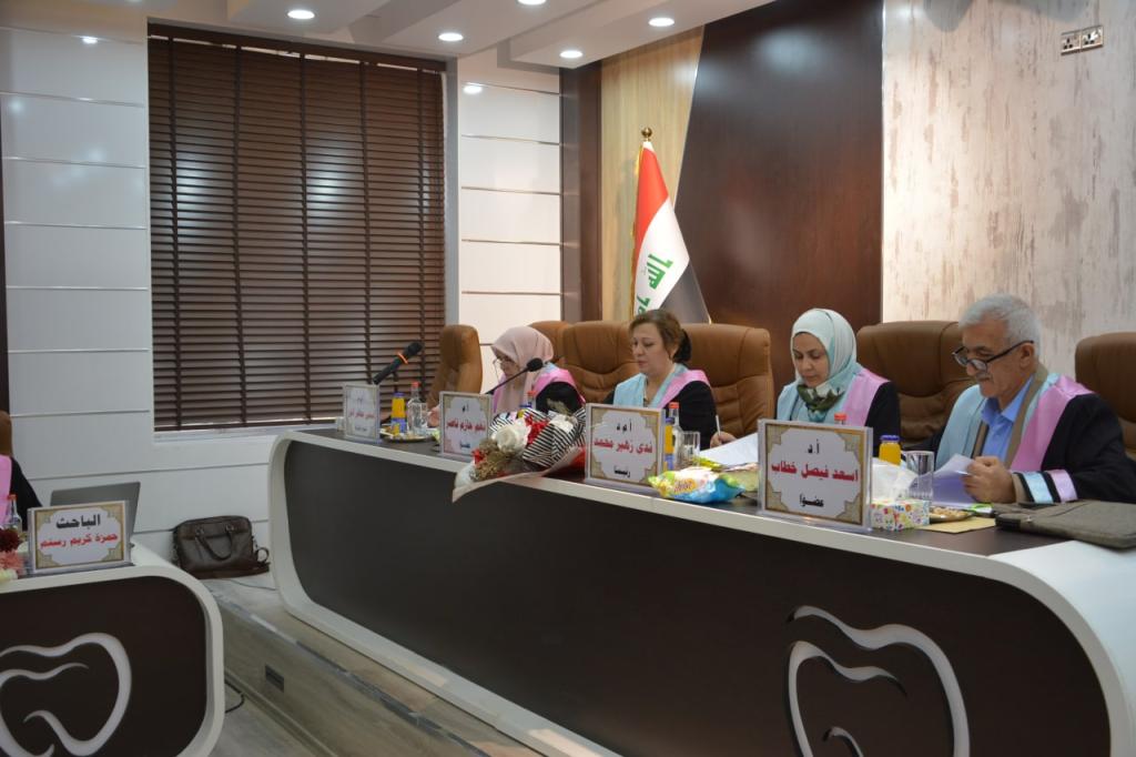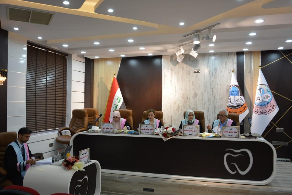 جرت اليوم الأربعاء الموافق ل ٥ /تشرين الأول/ ٢٠٢٢ وفي فرع صناعة الأسنان / كلية طب الاسنان/ جامعة الموصل مناقشة رسالة الماجستير الموسومة (تأثير طرق التطهير المختلفة على بعض خواص البطانة اللينة ذات الأساس الأكريلي)