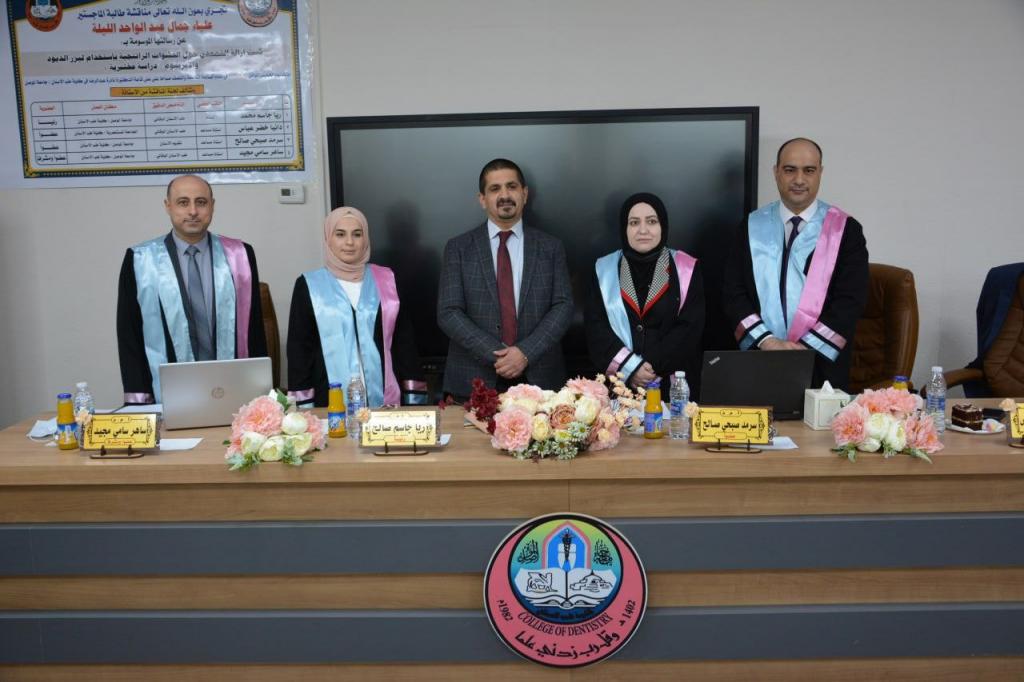 ناقشت كلية طب الأسنان يوم الخميس الموافق ل ٢٤/ آذار/٢٠٢٢ رسالة الماجستير تحت عنوان: “كبت إزالة التمعدن حول الحشوات الراتنجية باستخدام ليزر الديود والايربيوم”. تناولت فيها الطالبة “علياء جمال عبدالواحد”/ فرع الأطفال والتقويم وطب الأسنان الوقائي تقييم تأثير تعريض سطح مينا الأسنان حول الحشوات الراتنجية الى ليزر الدايود والإيربيوم. أثبتت الدراسة أن تشعيع مينا الأسنان حول الحشوات الراتنجية بواسطة ليزر الدايود والإيربيوم أدت إلى زيادة صلادة المينا وتحسين مقاومته لفقدان المعادن. ترأس لجنة المناقشة أ.د. ريا جاسم محمد/رئيساً/جامعة الموصل/كلية طب الأسنان وبعضوية كل من أ.م .د. داليا خضير عباس/ الجامعة المستنصرية/ كلية طب الاسنان و أ.م . د. سرمد صبحي صالح/ جامعة الموصل/كلية طب الاسنان وعضوية وإشراف أ.م. ساهر سامي مجيد /جامعة الموصل/كلية طب الاسنان . وتم قبول الرسالة بعد إجراء التعديلات اللازمة.‏