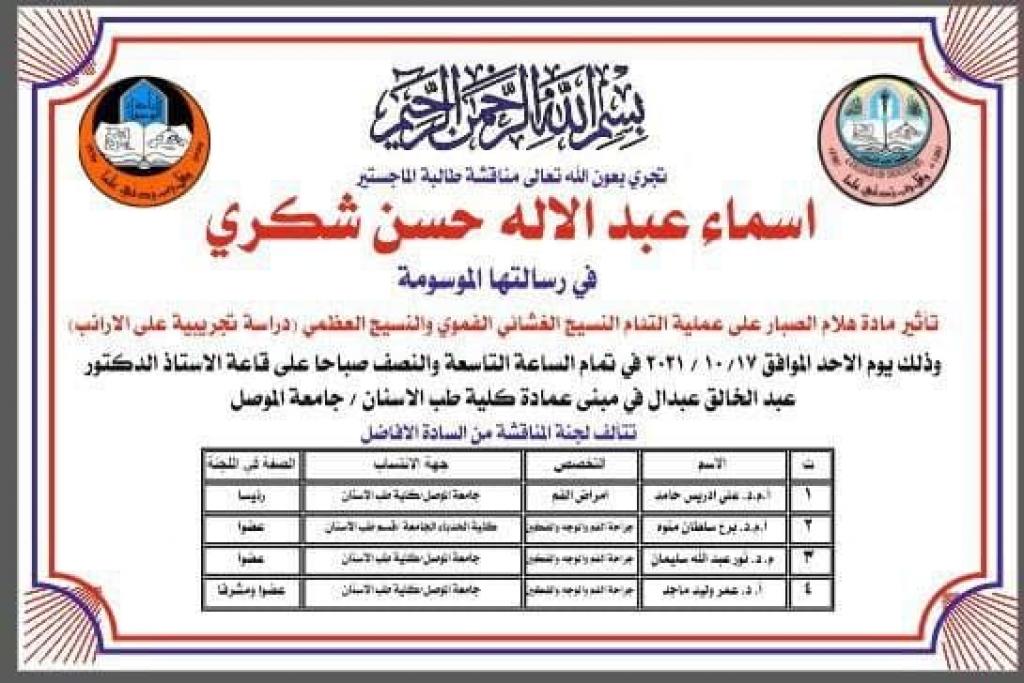 مناقشة رسالة ماجستير في كلية طب الأسنان/ فرع جراحة الفم و الوجه و الفكين
