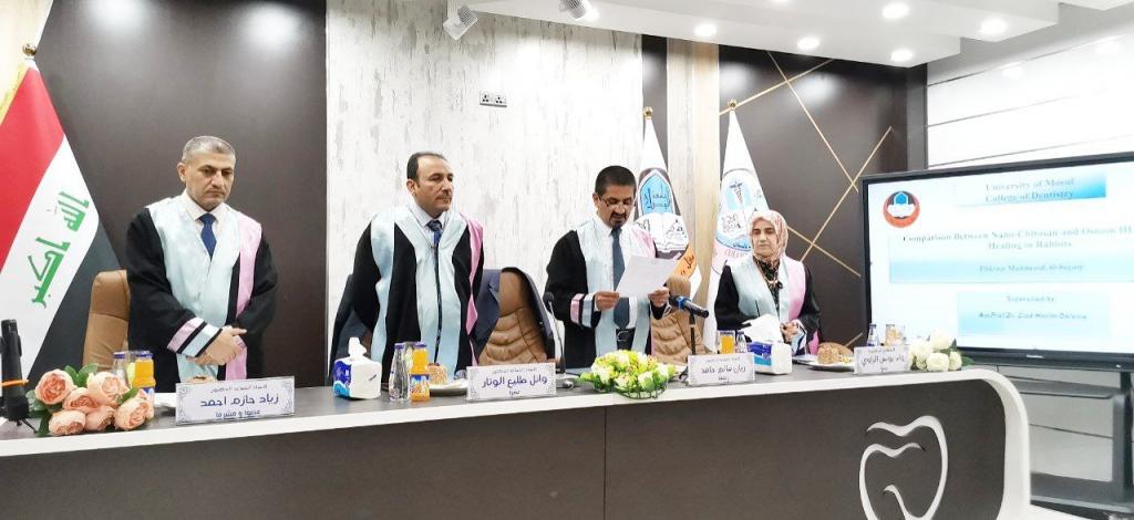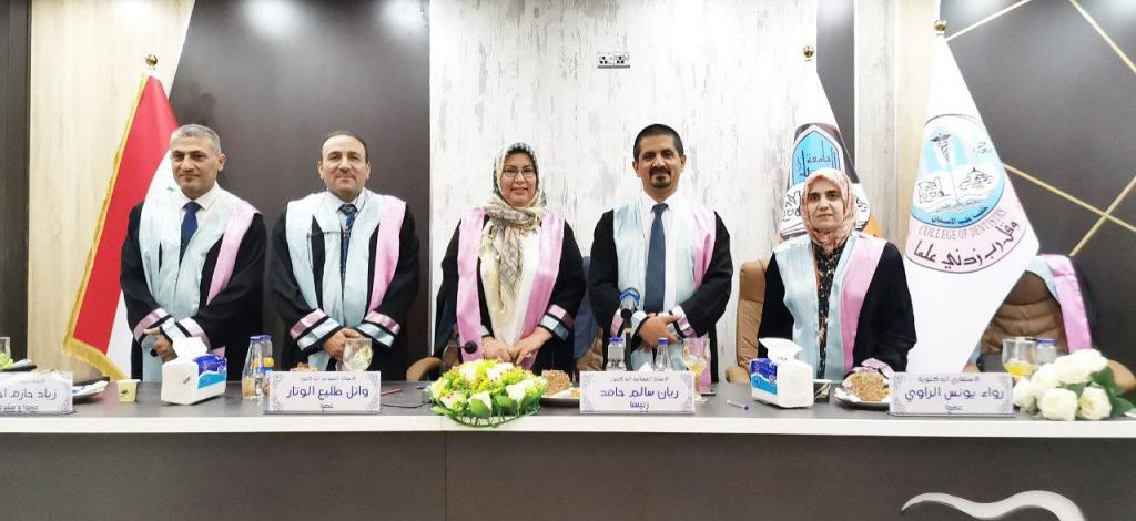 ترأس اللجنة ا. م. د. ريان سالم حامد/كلية طب الأسنان/جامعة الموصل وبعضوية كل من ا. م. د. وائل طليع الوتار /كلية طب الأسنان/ جامعة موصل والاستشاري د. رواء يونس الراوي/ دائرة صحة نينوى وعضوية وإشراف ا. م. د. زياد حازم احمد/ كلية طب الأسنان / جامعة الموصل. وتم قبول الرسالة بعد إجراء التعديلات اللازمة… الف الف مبروك