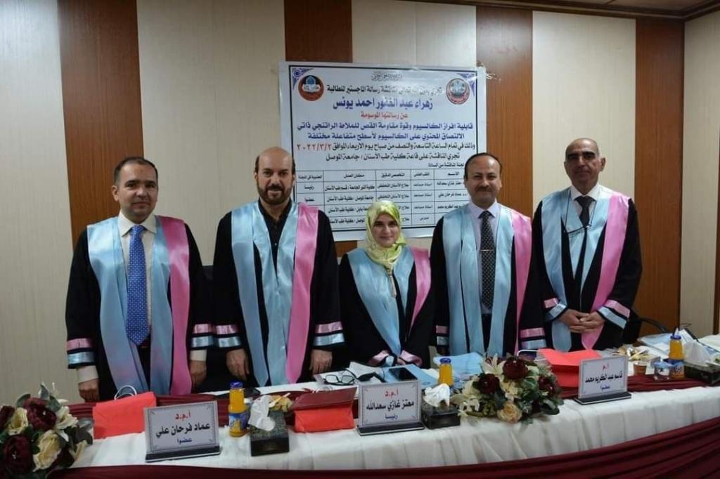 حول قابلية إفراز الكالسيوم وقوة مقاومة القص للملاط الراتنجي ذاتي الالتصاق المحتوي على الكالسيوم لأسطح متفاعلة مختلفة، وذلك يوم الأربعاء ٢/آذار /٢٠٢٢. تناولت فيها الطالبة زهراء عبد الغفور أحمد القطان في فرع العلاج التحفظي تقييم قوة رابطة القص لثلاثة أنواع من الملاط الراتنجي ذاتي اللصق مزدوج التصلب لثلاثة انواع من الأسطح المتفاعلة المختلفة مع تحديد نوع الفشل المرافق، وإجراء فحص مطيافية تشتت الطاقة بالأشعة السينية للتعرف على تأثير الملاط على الأسطح المختلفة.. كما هدفت هذه الدراسة لتقييم الإفراز التراكمي لأيون الكالسيوم من النسخة المستحدثة من الملاط الراتنجي ذاتي الالتصاق ثيراسيم كالسيوم في مدد زمنية متعددة وفي وسطين مختلفين في الأس الهيدروجيني، أحدهما قاعدي والآخر حامضي.أثبتت الدراسة أن الملاط الراتنجي المعزز بالكالسيوم أظهر زيادة في قوة رابطة القص للزركون بالمقارنة مع النوعين الآخرين بينما أظهر النوعان الآخران زيادة نسبية في قوة رابطة القص مع مينا السن والعاج كما أن الاسمنت الراتنجي ذاتي الالتصاق ثيراسيم كالسيوم له القدرة على افراز أيون الكالسيوم وأن المعدل التراكمي للافراز ليس مرتبطاً بتغير الأس الهيدروجيني للوسط المحيط، وأن الاسمنت يحتوي على أيون الفوسفات مما يزيد كفاءة إفراز الكالسيوم من الملاط.ترأس لجنة المناقشة أ.م.د معتز غازي سعد الله كلية النور الجامعة/ قسم طب الأسنانوبعضوية كل من أ.م.د عماد فرحان علي جامعة الموصل / كلية طب الأسنانوأ.م. قاسم عبد الكريم محمد/ جامعة بابل / كلية طب الأسنانو م.د علي مؤيد رشيد /جامعة الموصل / كلية طب الأسنان عضواً ومشرفاًوتم قبول الرسالة بعد إجراء التعديلات اللازمة