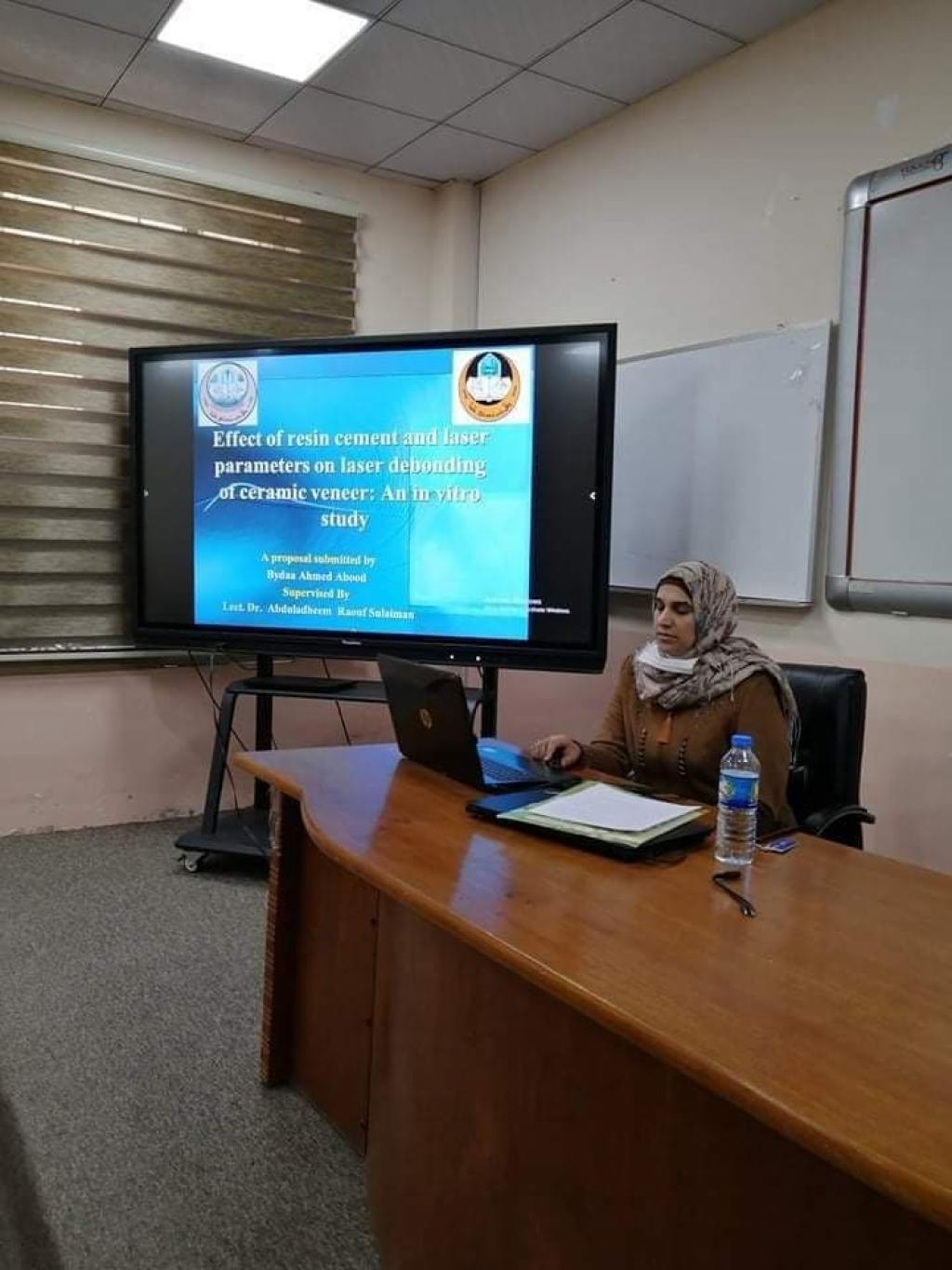 تم في يوم الخميس المصادف 28/1/2021 مناقشة مشروع ماجستير الطالبة بيداء احمد في فرع العلاج التحفظي باشراف م.د.عبدالعظيم رؤوف والموسومة: