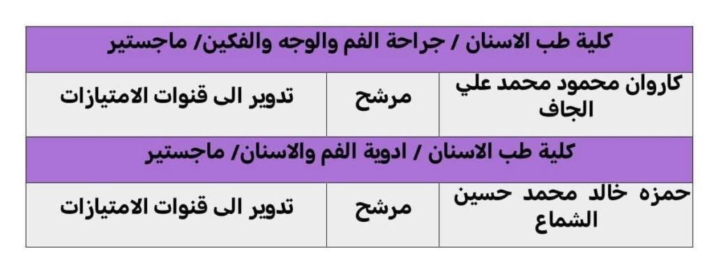 تُعلن كلية طب الأسنان – جامعة الموصل، إلى الطلبة المقبولين في الدراسات العليا للعام الدراسي 2025 – 2026، بضرورة ملء الاستمارة الخاصة بفحص تعاطي المخدرات والمؤثرات العقلية والمرفقة في الرابط أدناه، على أن يتم ختمها أصولياً من قبل شعبة الدراسات العليا في الكلية.