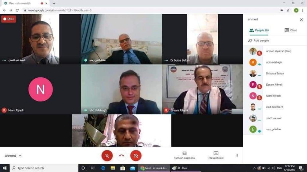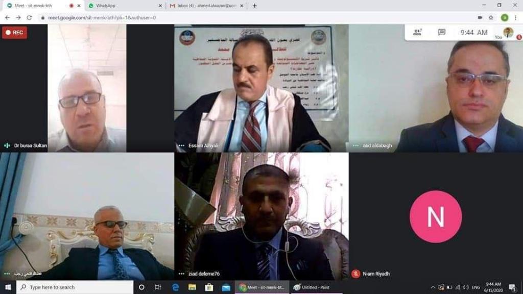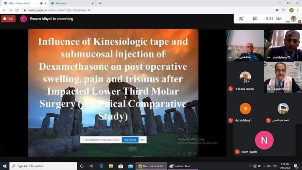 أقيمت على بركة الله اليوم الإثنين ١٥/حزيران /٢٠٢٠ مناقشة رسالة الماجستير (اونلاين) للطالب : عصام عبد الله محمد مجيد في جراحة الفم والوجه والفكين و المعنونة ب:( تأثير شريط الكنيسيولجسك و حقن الدكساميثازون تحت الأنسجة الموية المخاطية على المضاعفات المتوقعة بعد عمليات القلع الجراحي لسن العقل المطمور ، دراسة مقارنة)