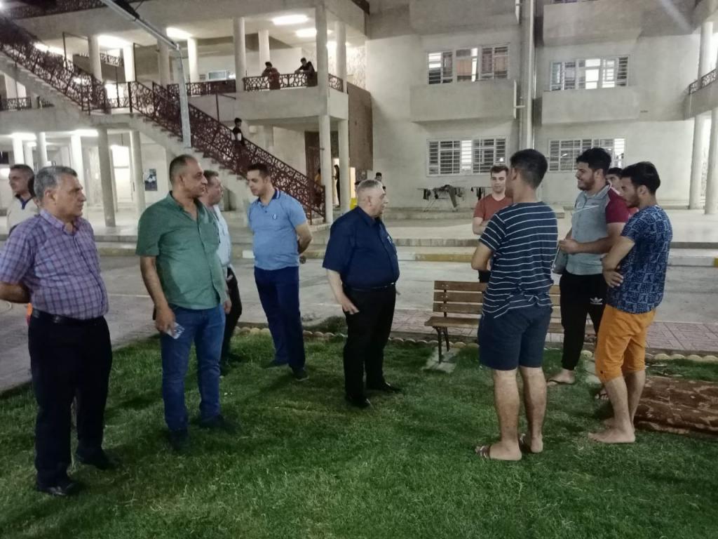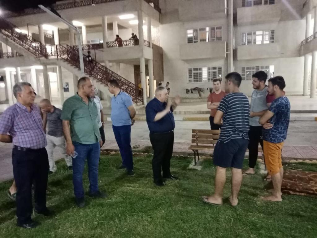 السيد معاون رئيس الجامعه للشؤون العلميه الاستاذ الدكتور منير سالم طه المحترم برفقة السيد مدير قسم شؤون الاقسام الداخليه الاستاذ يوسف حامد الملا يجري جولة ميدانية مساء يوم الاحد ٦/١٩ شملت مجمع الفاروق السكني للطلاب للأطلاع على الخدمات المقدمه للطلبه والوقوف على اهم المعوقات وتذليلها من اجل تقديم افضل ما يمكن للطلبه خلال هذه الفترهحيث قام السيد المساعد بالتجول داخل اروقة الاقسام واللقاء بالطلبه لطرح المشاكل التي تواجههم ودعمهم وتوفير الاحتيجات الضروريه وتبادل الرؤىو مناقشة بعض الصعاب بصوره عامه وحلحلتها