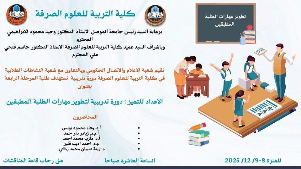 برعاية السيد رئيس جامعة الموصل الاستاذ الدكتور وحيد محمود الإبراهيمي المحترم وبإشراف السيد عميد كلية التربية للعلوم الصرفة الاستاذ الدكتور جاسم فتحي علي المحترم اقامت شعبة الإرشاد النفسي الجامعي وبالتعاون مع شعبة الدراسات العليا في كليتنا ندوة إرشادية لطلبة الدراسات العليا المقبولين للعام الدراسي ٢٠٢٥-٢٠٢٦ بعنوان” الدعم النفسي والإداري لطلبة الدراسات العليا” وذلك يوم الاثنين الموافق ٦ تشرين الاول ٢٠٢٥ حاضر فيها: