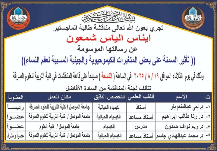 إعلان مناقشة اطروحة دكتوراه – قسم علوم الحياة