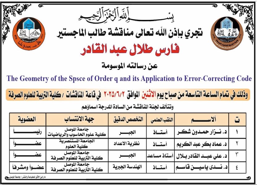 إعلان مناقشة رسالة ماجستير – قسم الرياضيات