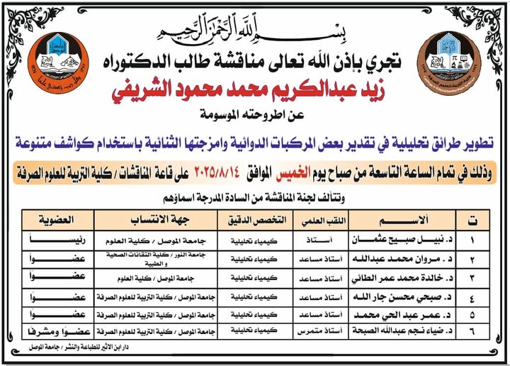إعلان مناقشة اطروحة دكتوراه - قسم الكيمياء