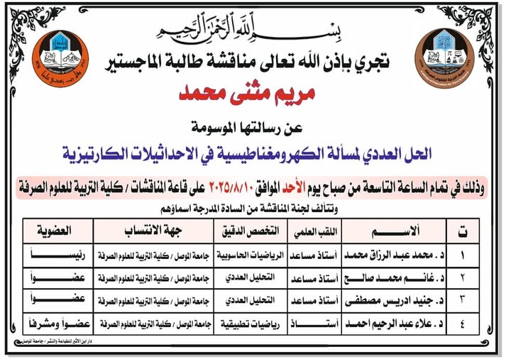إعلان مناقشة رسالة ماجستير – قسم الرياضيات