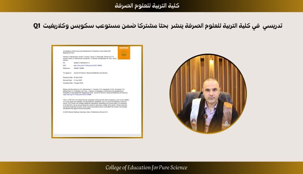 تدريسي في كلية التربية للعلوم الصرفة - قسم الكيمياء ينشر بحثا علميا (تخصص البوليمر ) في احد اهم المجلات العالمية الرصينة Q1....