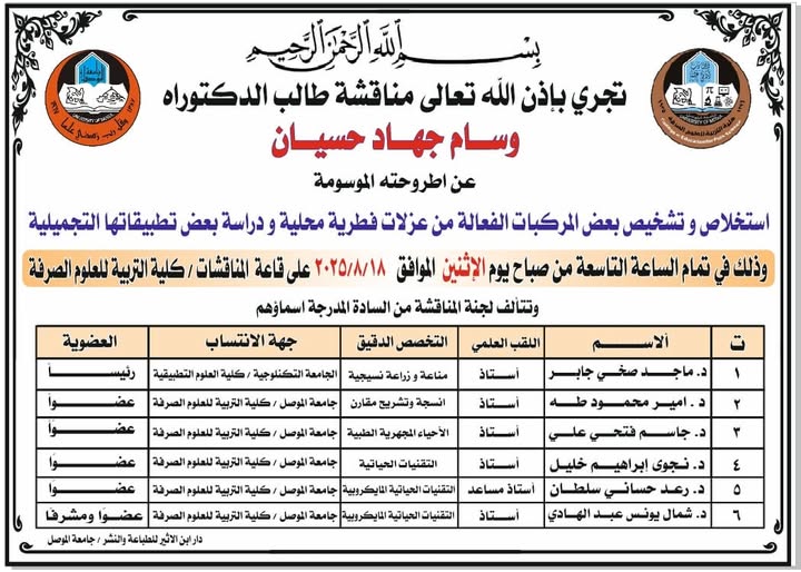 إعلان مناقشة رسالة ماجستير – قسم الكيمياء