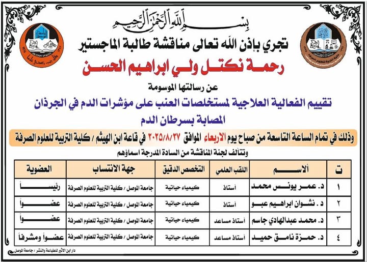 إعلان مناقشة رسالة ماجستير – قسم علوم الحياة