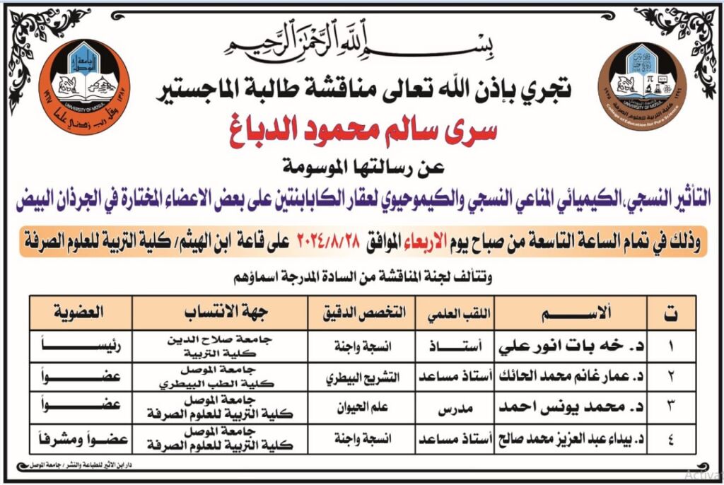 إعلان موعد مناقشة رسالة ماجستير - قسم علوم الحياة