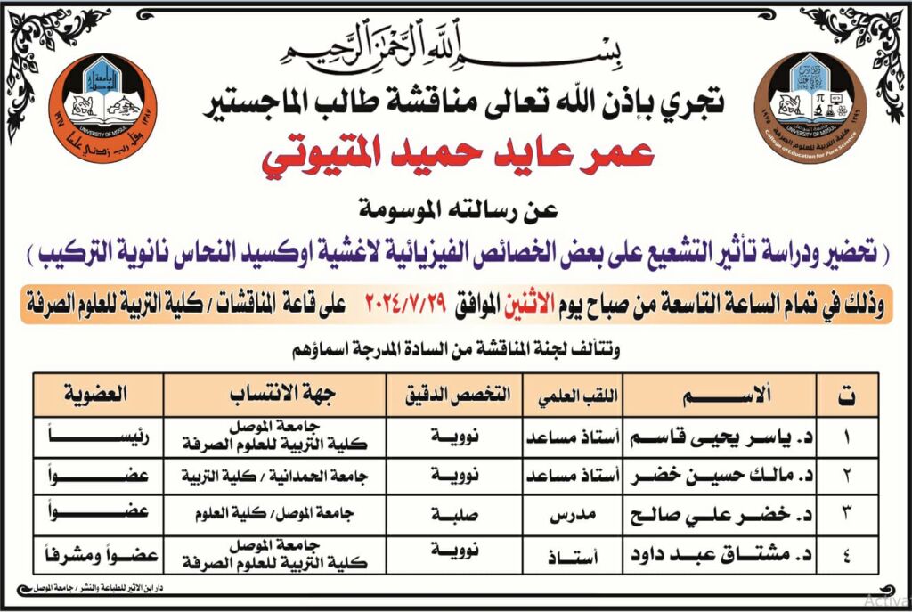 إعلان موعد مناقشة رسالة ماجستير- قسم الكيمياء