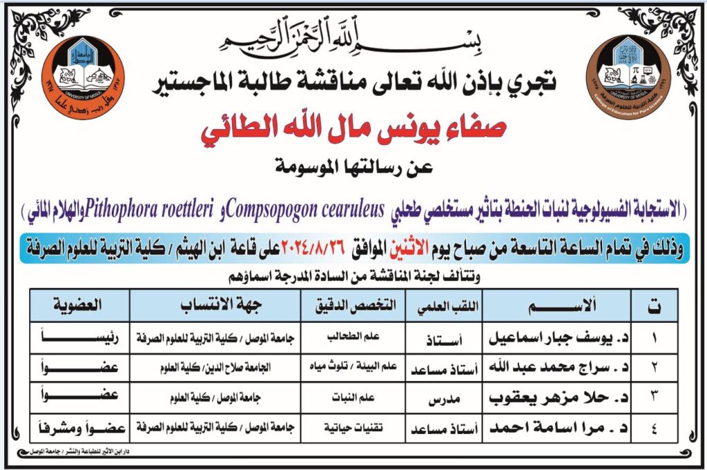 إعلان موعد مناقشة رسالة ماجستير - قسم علوم الحياة