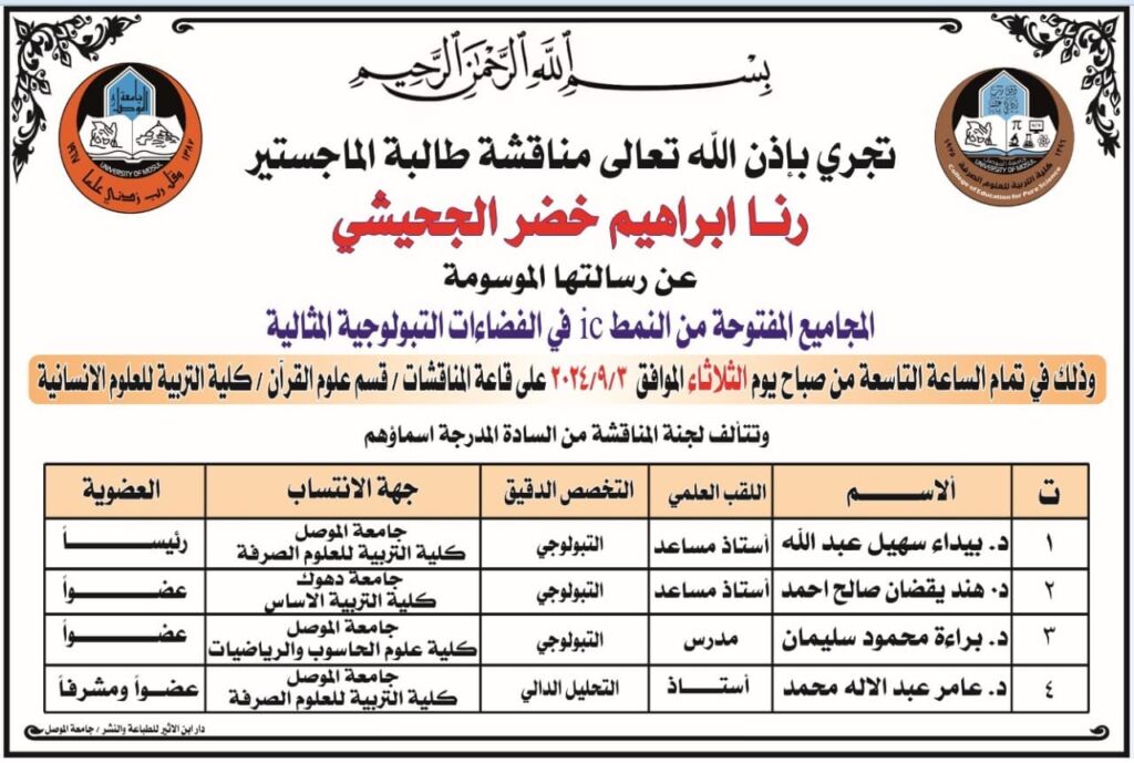 إعلان موعد مناقشة رسالة ماجستير – قسم الرياضيات
