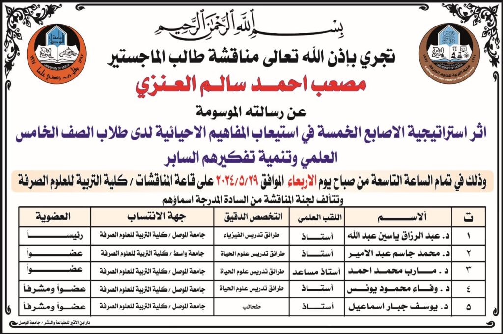 إعلان موعد مناقشة رسالة ماجستير- قسم علوم حياة