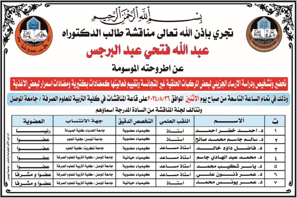 إعلان موعد مناقشة رسالة ماجستير – قسم علوم الحياة