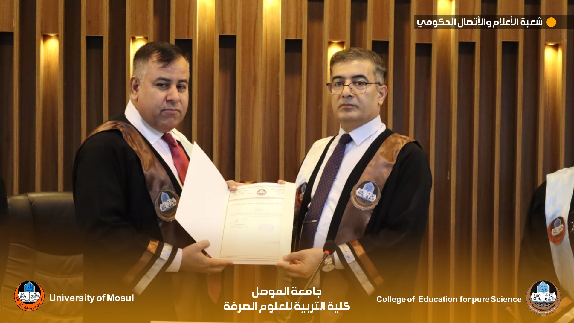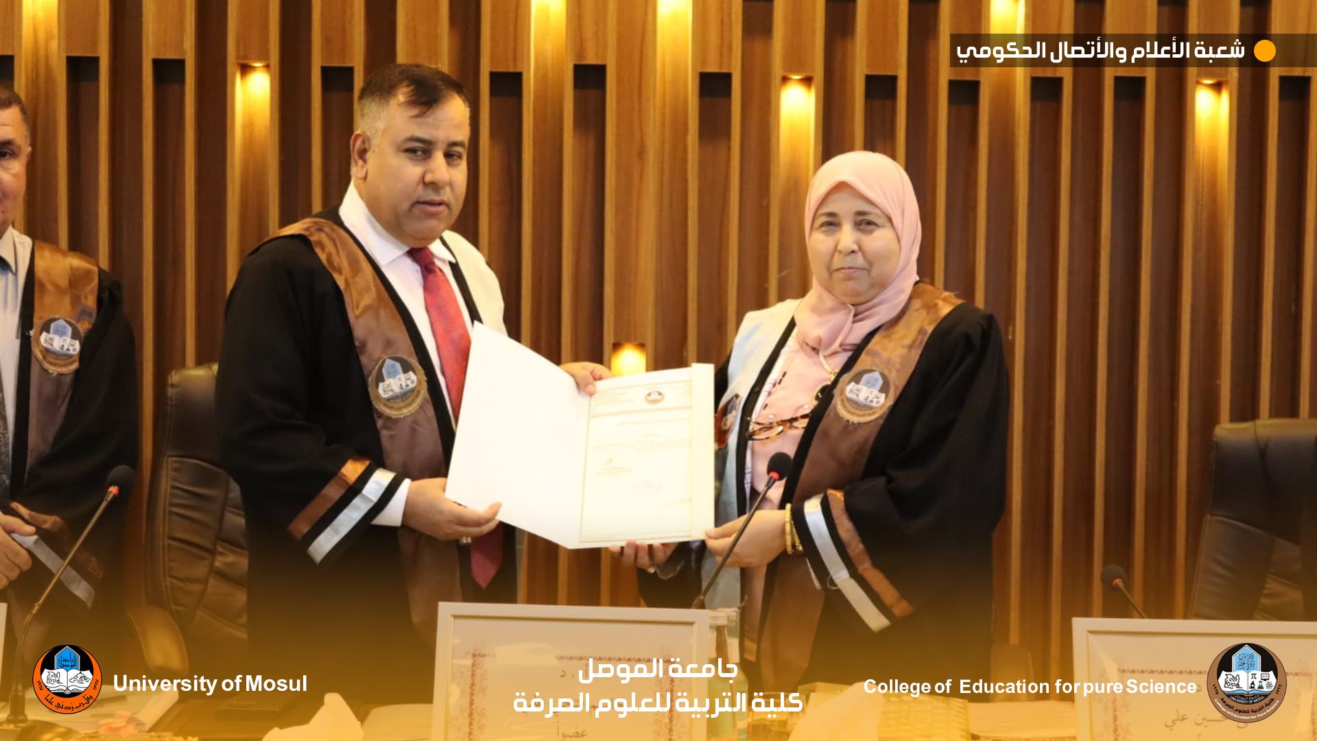 وقدم السيد عميد الكلية المحترم كتاب شكر وتقدير الى الأستاذ الدكتورة منى حسين علي من كلية العلوم / جامعة الموصل والاستاذ المساعد الدكتور سراج محمد عبدالله من كلية العلوم / جامعة صلاح الدين-اربيل وذلك لمشاركتهما في مناقشة الطالب.