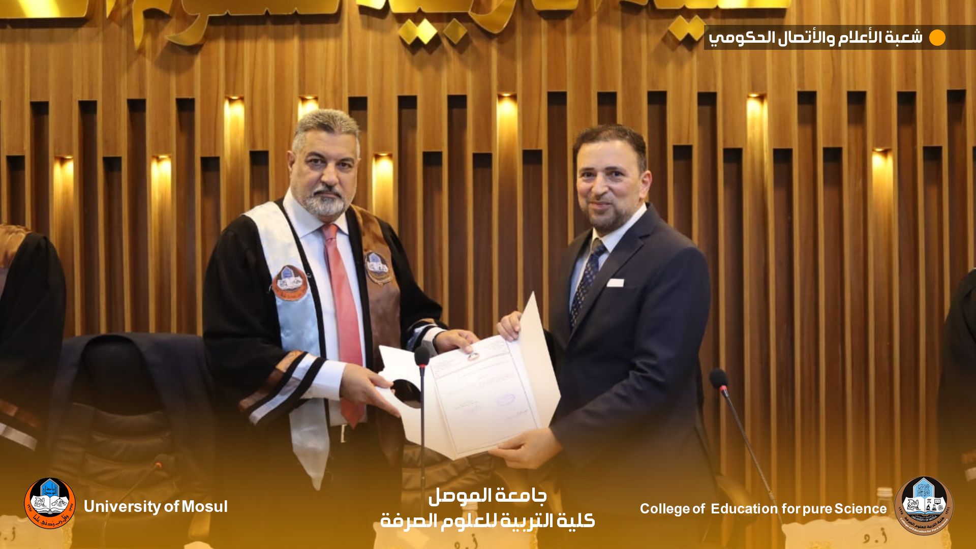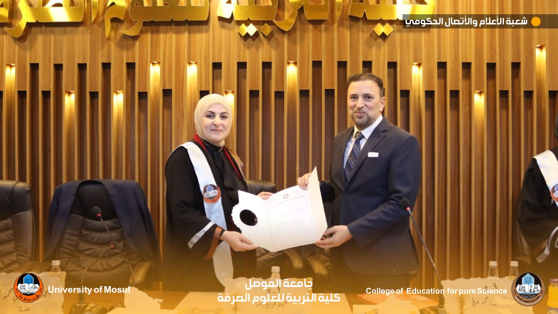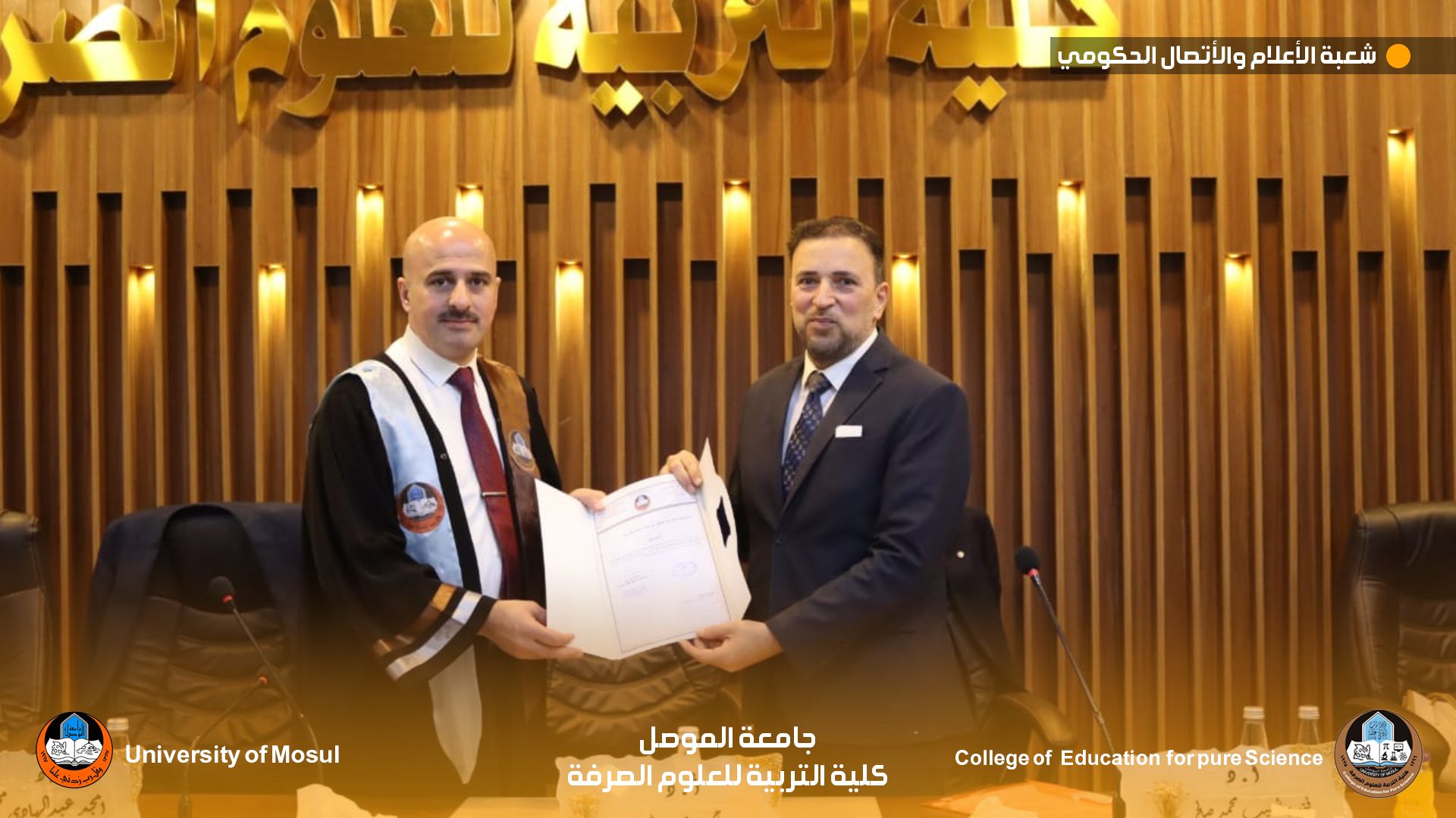 وقدم السيد رئيس قسم علوم الحياة المحترم نيابة عن السيد عميد الكلية المحترم كتاب شكر وتقدير الى الاستاذ الدكتور امجد عبدالهادي محمد من كلية العلوم/ جامعة الموصل والأستاذ المساعد الدكتورة ابتسام ناظم حازم من الجامعة التقنية الشمالية / المعهد التقني الطبي الموصل والأستاذ الدكتور مثنى جاسم محمد من كلية العلوم البيئية / جامعة الموصل تثمينا لجهودهم المبذولة في المناقشة.