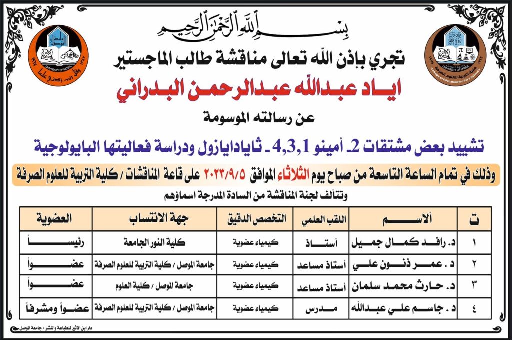 موعد مناقشة رسالة ماجستير -قسم الكيمياء