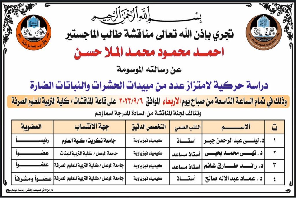 موعد مناقشة أطروحة دكتوراه -قسم علوم الحياة