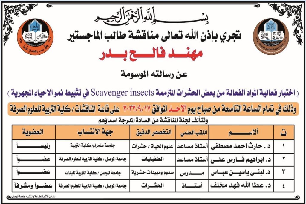 موعد مناقشة رسالة ماجستير -قسم علوم الحياة