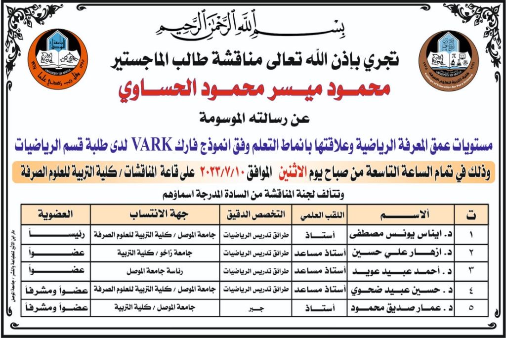 موعد مناقشة رسالة ماجستير -طرائق تدريس -قسم الرياضيات