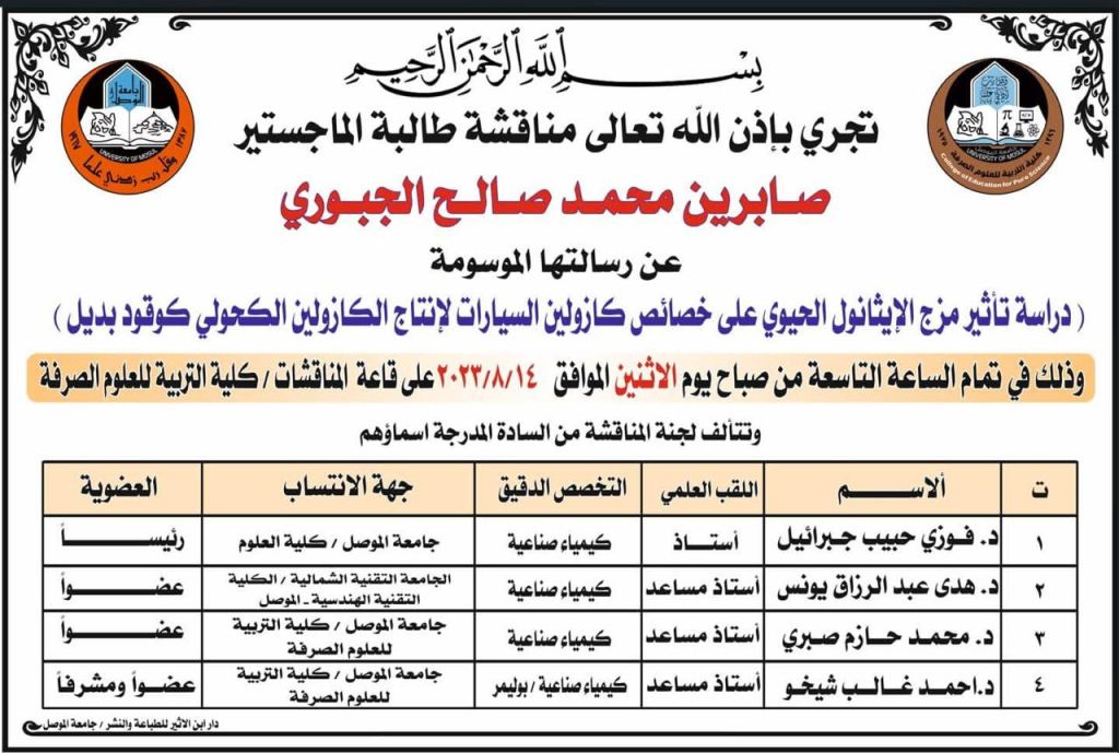 موعد مناقشة رسالة ماجستير -قسم الكيمياء