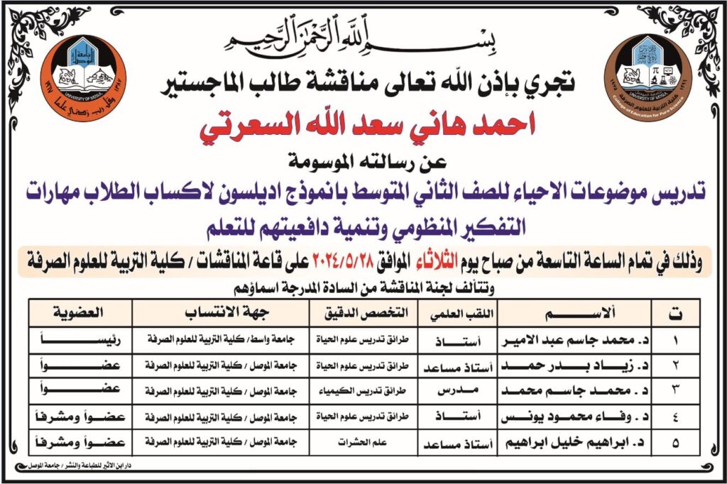 إعلان موعد مناقشة رسالة ماجستير- قسم علوم حياة