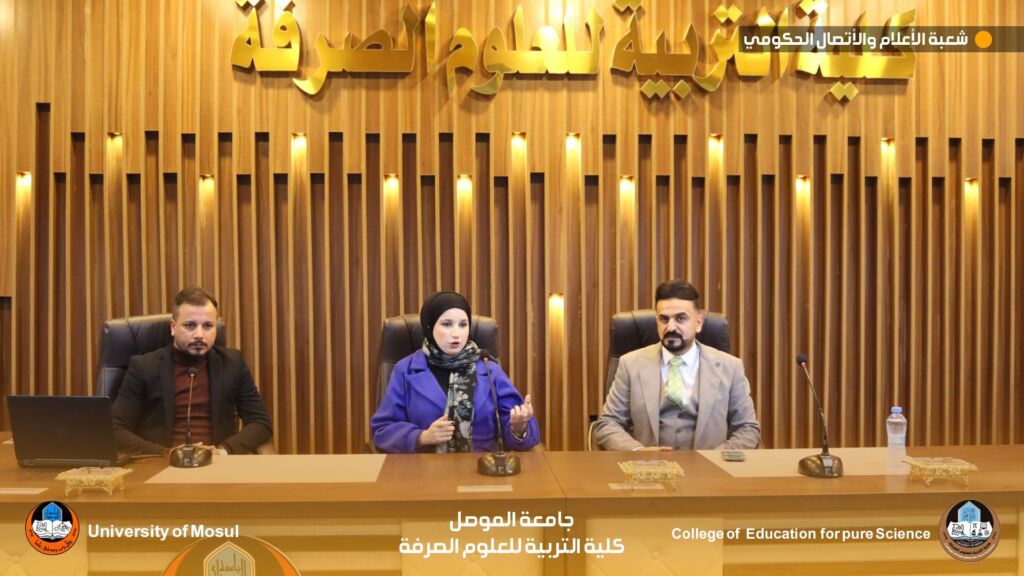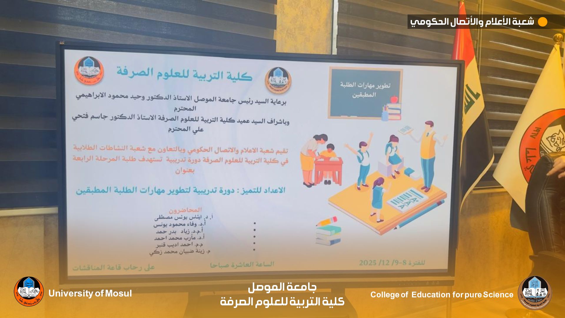 برعاية السيد رئيس جامعة الموصل الاستاذ الدكتور وحيد محمود الإبراهيمي المحترم وبإشراف السيد عميد كلية التربية للعلوم الصرفة الاستاذ الدكتور جاسم فتحي علي المحترم اقامت شعبة الإعلام والاتصال الحكومي وبالتعاون مع شعبة النشاطات الطلابية في الكلية دورة تدريبية بعنوان ” الاعداد للتميز دورة تدريبية لتطوير مهارات الطلبة المطبقين” استهدفت الدورة، التي انطلقت اليوم الثلاثاء الموافق ٩ كانون الأول ٢٠٢٥، طلبة المرحلة الرابعة، سعياً إلى تأهيلهم وإكسابهم المهارات اللازمة قبل دخولهم مرحلة التطبيق العملي في المدارس وشارك في تقديم محاور الدورة مجموعة متميزة من أعضاء الهيئة التدريسية، وهم: