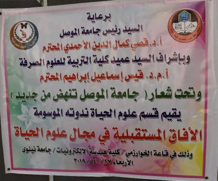 بحضور السيد رئيس جامعة الموصل الاستاذ الدكتور قصي كمال الدين الأحمدي وباشراف عميد كلية التربية للعلوم الصرفة الاستاذ المساعد الدكتور قيس اسماعيل ابراهيم ورئيس قسم علوم الحياة الدكتور عدنان وضمن نشاطات كلية التربية للعلوم الصرفة اقام قسم علوم الحياة ندوته الموسومة "الآفاق المستقبلية في مجال علوم الحياة" صباح هذا اليوم ١٧-٤-٢٠١٩ حيث تخللها مواضيع حيوية تهدف الى توعية المجتمع من مخاطر الامراض العصرية وتم منح المشاركين شهادة مشاركة .