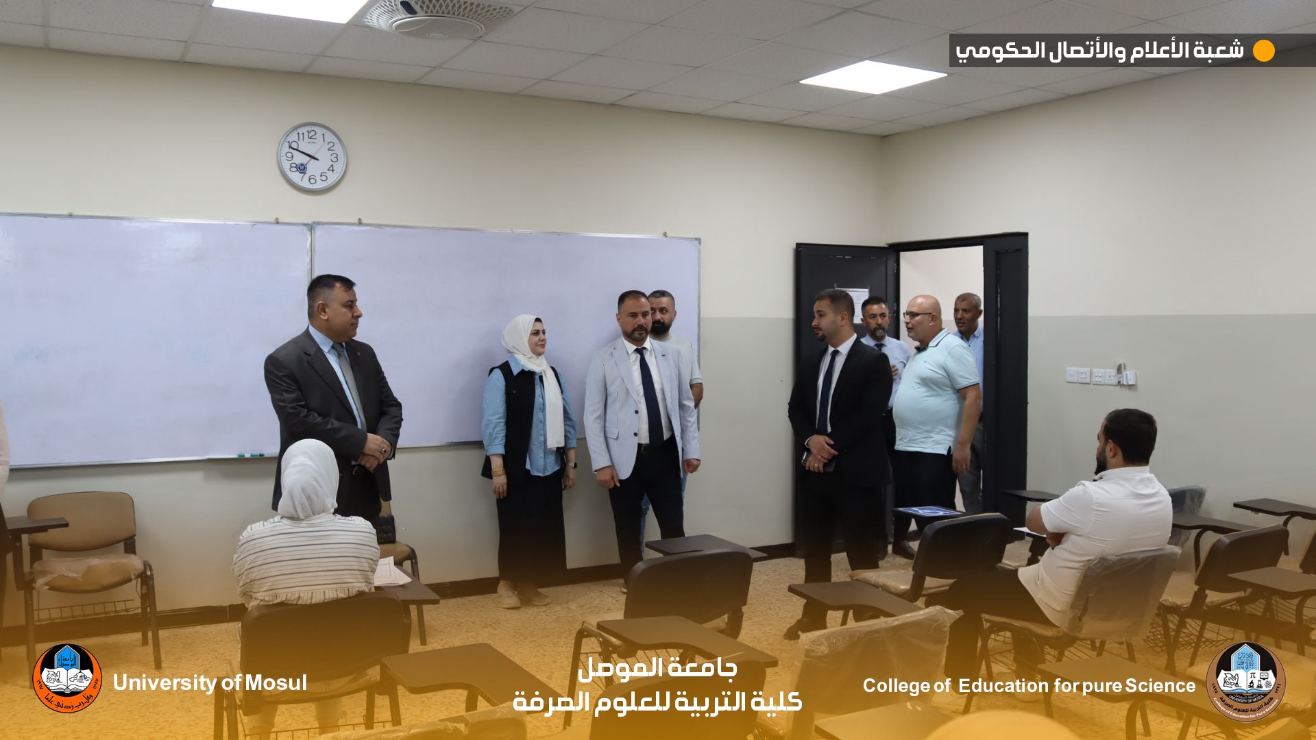 تفقد السيد عميد كلية التربية للعلوم الصرفة الاستاذ الدكتور جاسم فتحي علي المحترم وبرفقته السيد معاون العميد للشؤون العلمية الاستاذ المساعد الدكتور عزام صلاح الدين يونس المحترم صباح اليوم الإثنين الموافق ١ أيلول ٢٠٢٥ القاعات الامتحانية في الكلية للإطلاع على سير أداء الامتحانات النهائية لطلبة الدراسات الأولية والدراسات العليا/ الدور الثاني وأشاد السيد العميد بالجهود المبذولة من قبل رؤساء الاقسام العلمية واللجان الامتحانية والكادر التدريسي وجميع القائمين على العملية الامتحانية،متمنيًا لجميع الطلبة دوام التوفيق والنجاح .