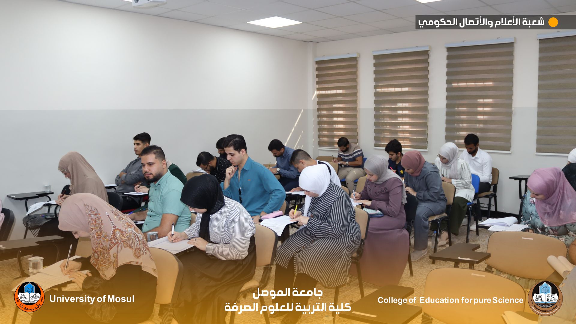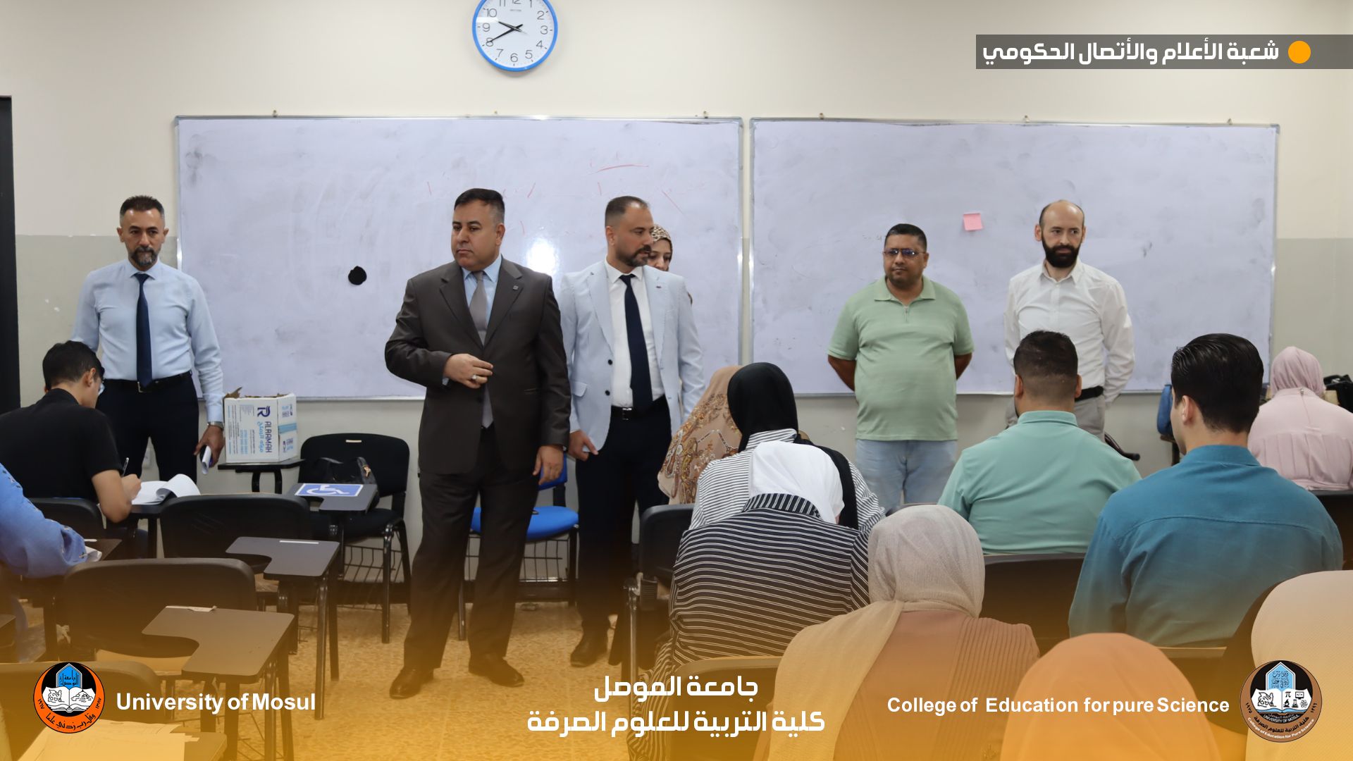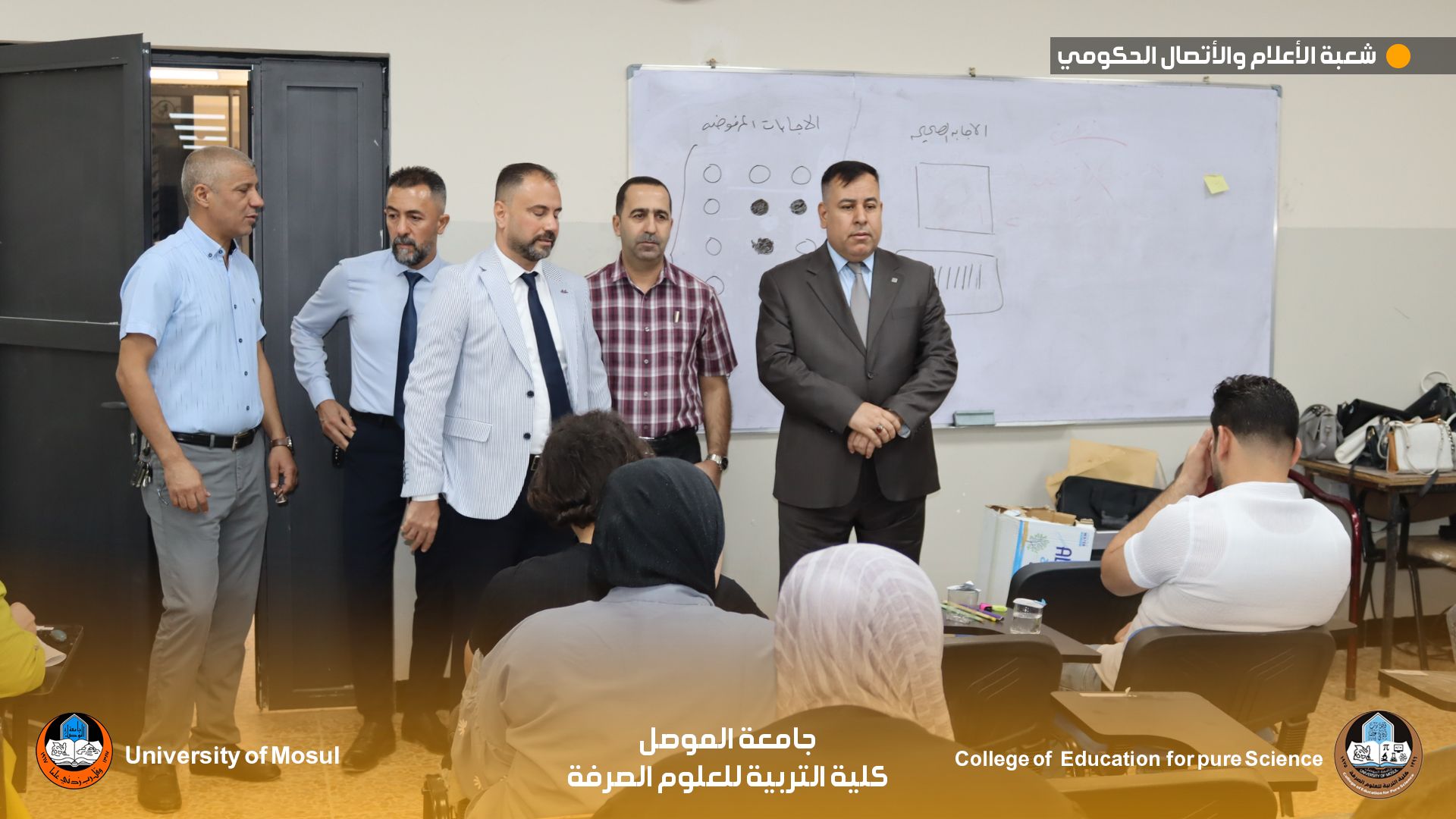 تفقد السيد عميد كلية التربية للعلوم الصرفة الاستاذ الدكتور جاسم فتحي علي المحترم وبرفقته السيد معاون العميد للشؤون العلمية الاستاذ المساعد الدكتور عزام صلاح الدين يونس المحترم صباح اليوم الإثنين الموافق ١ أيلول ٢٠٢٥ القاعات الامتحانية في الكلية للإطلاع على سير أداء الامتحانات النهائية لطلبة الدراسات الأولية والدراسات العليا/ الدور الثاني وأشاد السيد العميد بالجهود المبذولة من قبل رؤساء الاقسام العلمية واللجان الامتحانية والكادر التدريسي وجميع القائمين على العملية الامتحانية،متمنيًا لجميع الطلبة دوام التوفيق والنجاح .