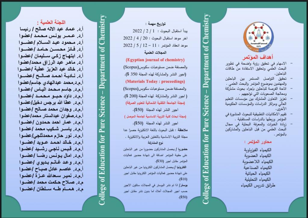 على الراغبين بالمشاركة الحضورية او الالكترونية في المؤتمر الدولي الثالث للكيمياء والمقام من قبل مركز اليرموك للدراسات والتخطيط الاستراتيجي فرع نينوى وبالتعاون مع قسم الكيمياء- كلية التربية للعلوم الصرفة – جامعة الموصل للفترة من 11 الى 12 أيار 2022 .يرجى مراجعة قسم الكيمياء لتسجيل أسمائهم بالنسبة للمشاركة الحضورية.او الاتصال على ارقام الهواتف التالية 07511954286 – 07701610332 بالنسبة للمشاركة الالكترونية وهناك رابط الكتروني لمشاهدة فعاليات المؤتمر سينشر لاحقا.علما ان اجور المشاركة الحضورية 35000 الف دينار عراقي ويحصل فيها الباحث على شهادة حضور فعاليات المؤتمر مع حقيبة المؤتمر , واجور المشاركة الالكترونية 15000 دينار عراقي يحصل فيه الباحث على شهادة حضور فعاليات المؤتمر.ادناه البروشور الخاص بالمؤتمر الدولي الثالث للكيمياء – كلية التربية للعلوم الصرفة