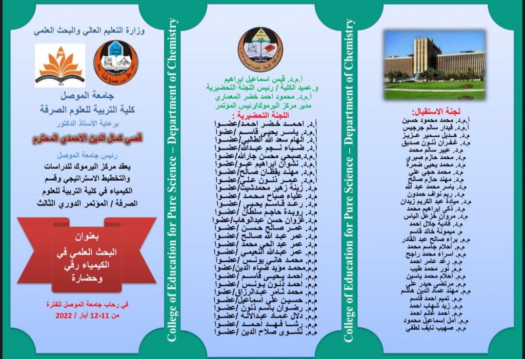 بسم الله الرحمن الرحيمبرعاية السيد رئيس جامعة الموصل ا.د. قصي كمال الدين الاحمدي وبإشراف عميد كلية التربية للعلوم الصرفة ا.م.د. قيس إسماعيل إبراهيم وبرئاسة مدير مركز اليرموك أ.م.د. محمود احمد خضر المعماري يعقد المؤتمر الدوري الثالث للكيمياء في رحاب كلية التربية للعلوم الصرفة تحت شعار البَحْثْ العلمي في الكيمياء رُقِيّ و حَضارة والمقام من قبل مركز اليرموك للبحوث والدراسات الاستراتيجية بالتعاون مع قسم الكيمياء كلية التربية للعلوم الصرفة جامعة الموصل للفترة من 11 الى 12 أيار 2022 مؤتمر الكيمياء العلمي الدوري الثالث يستقبل الأوراق البحثية الكاملة والمتحدثون في الجلسات الخاصة ومقترحات ورش العمل : مجموعات / باحثون / باحثون أجانب / طلاب .للمزيد من المعلومات يرجى زيارة الموقع الالكتروني للمؤتمر : https://sites.google.com/view/epschemconf22
